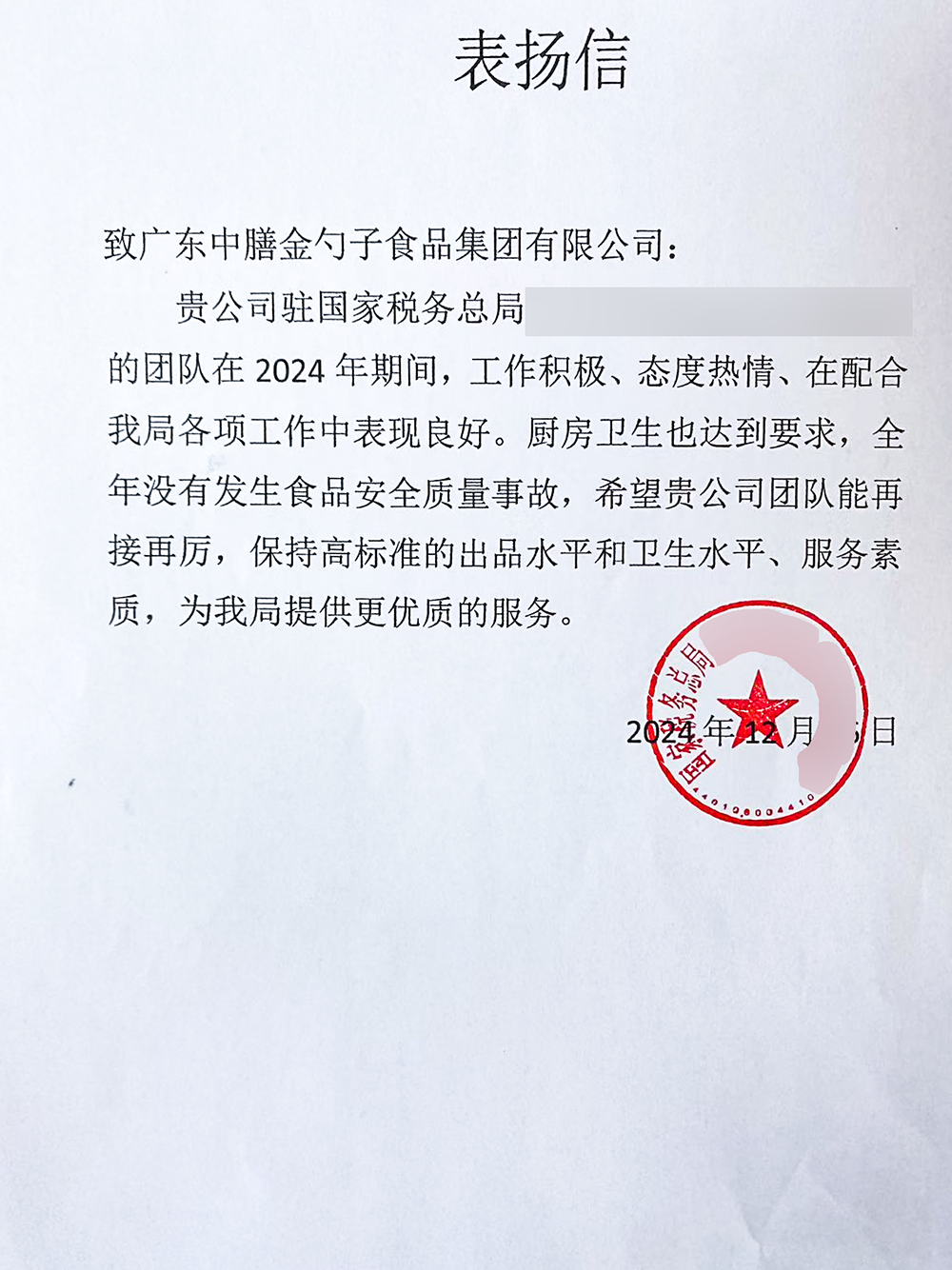 6、2024年7月,金勺子食品集团董事长黄金盾荣获“2024团餐服务优秀青年企业家”称号。