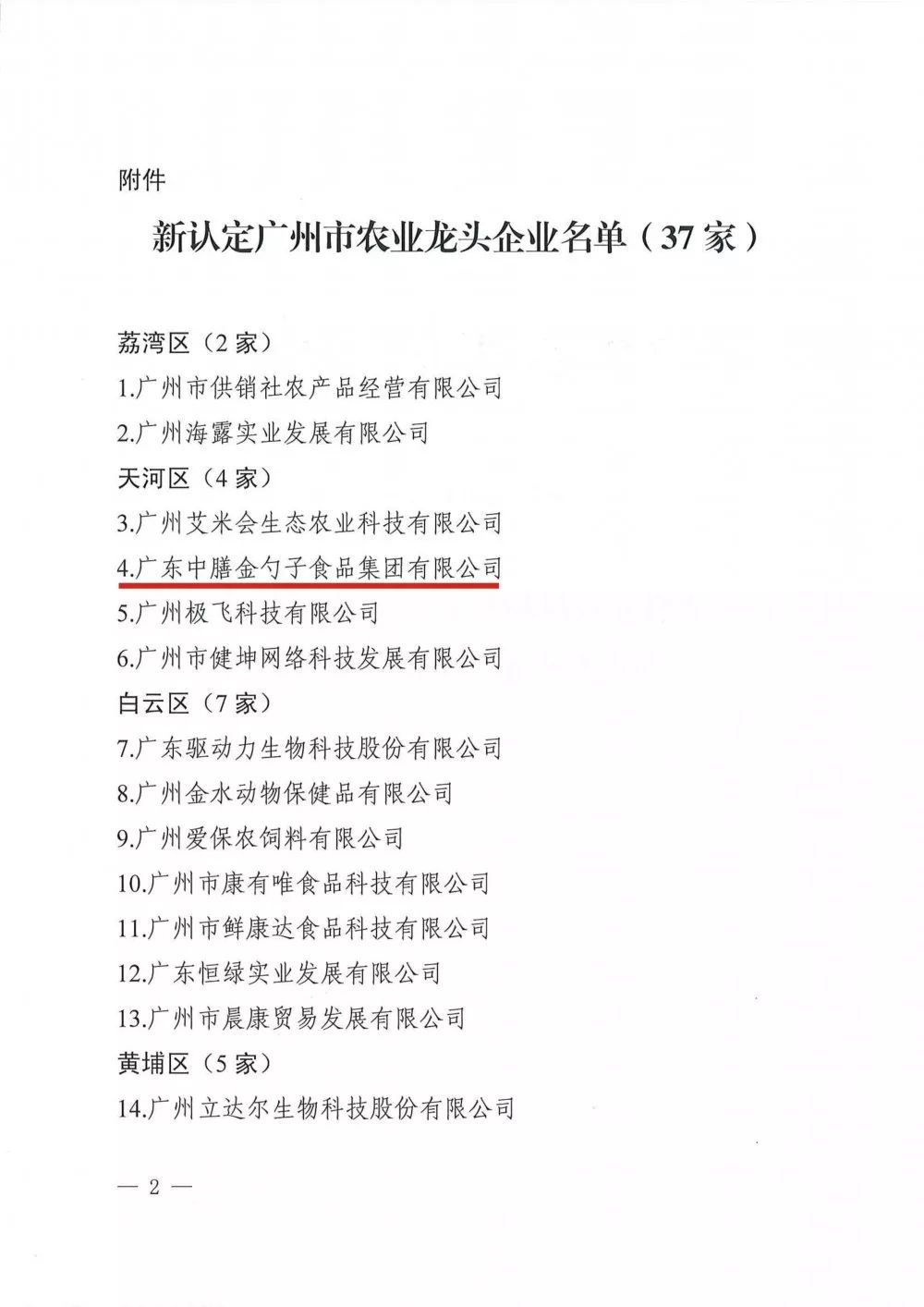 11月11日,《广州市农业农村局关于公布2019年新认定广州市农业龙头企业名单的通知》正式公布,公开新认定37家广州市农业龙头企业名单,广东中膳金勺子食品集团有限公司名列之中。