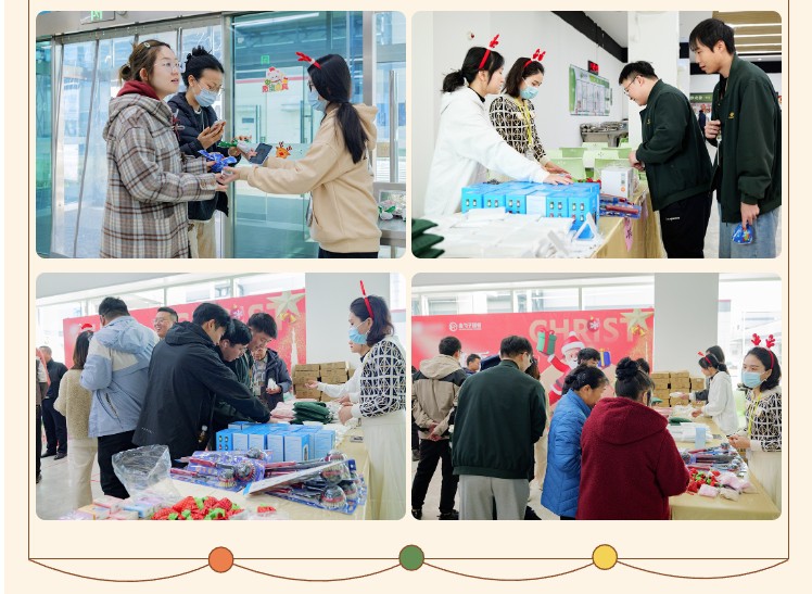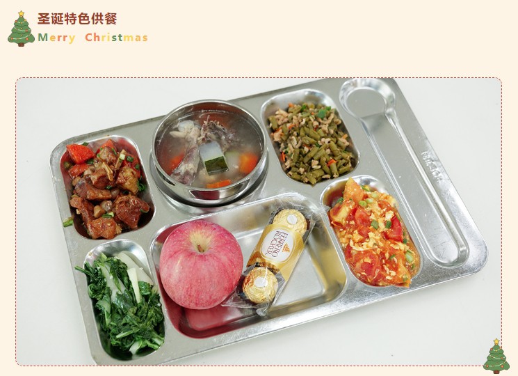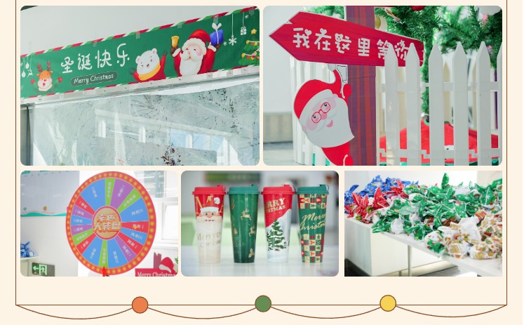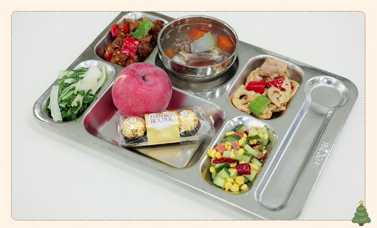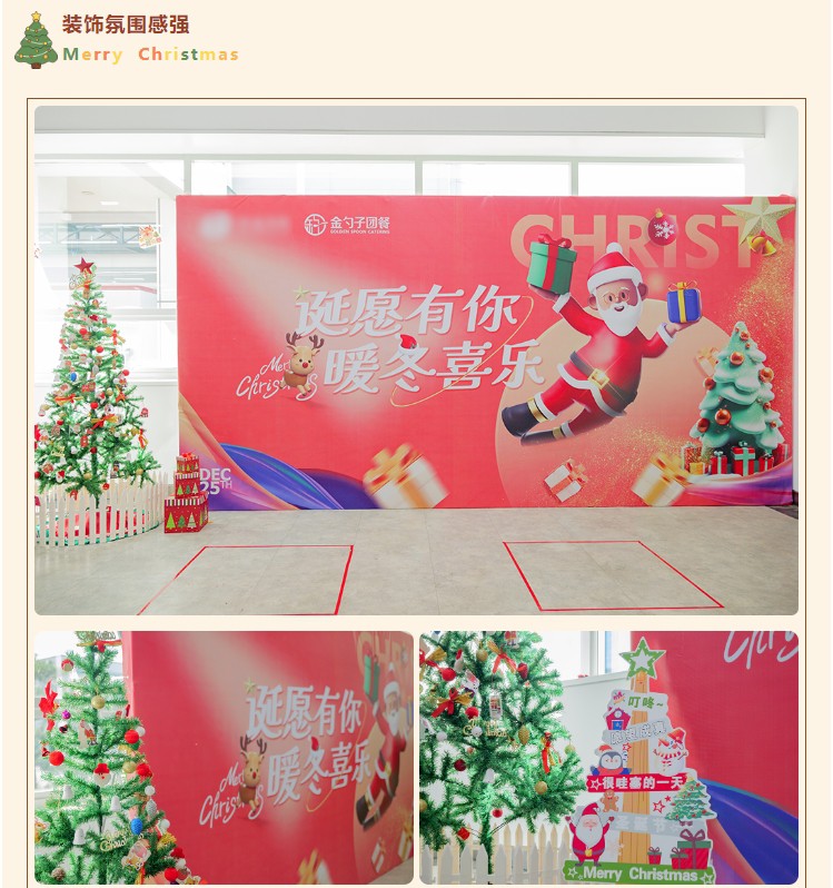为增强活动的氛围感和体验感,食堂内部进行了精心布置。可爱的卡通海报、驯鹿的场景、丰富的礼品、动听的音乐、各种节日特色供餐共同治愈焦虑填满幸福感,让员工感受到金勺子团队的服务热情。