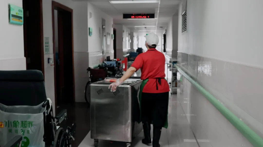面带微笑,步履轻盈,用保温车一层一层配送,
