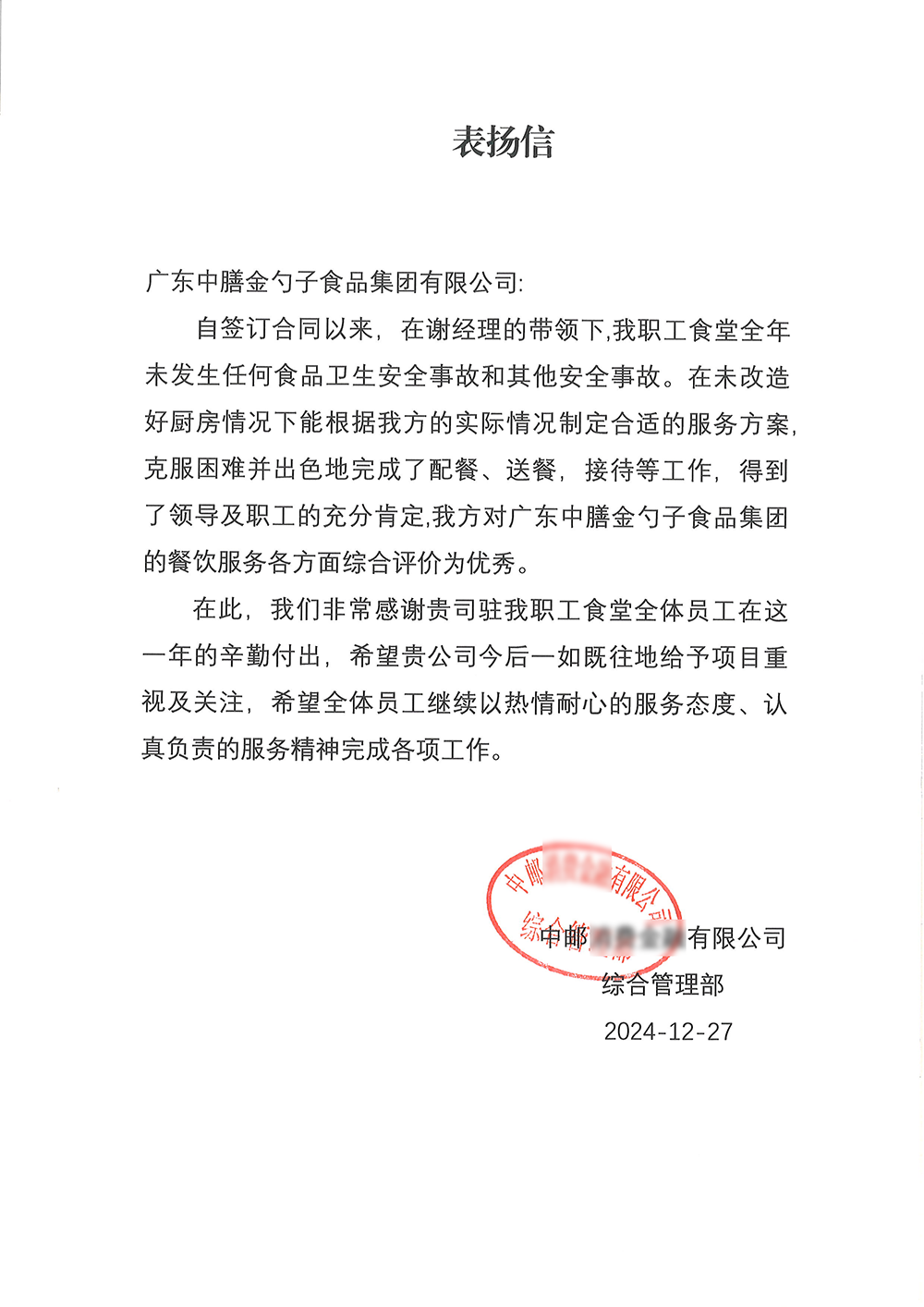 6、2024年7月,金勺子食品集团董事长黄金盾荣获“2024团餐服务优秀青年企业家”称号。