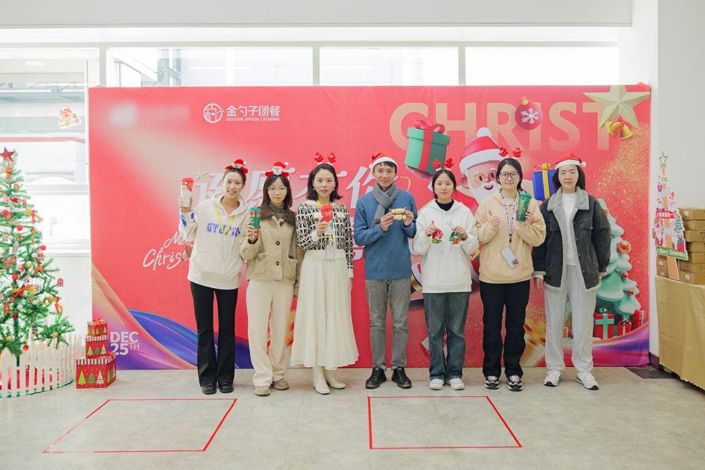 恒信彩 12月25日,金勺子团餐658门店举办一场欢乐温暖的《诞愿有您·暖冬喜乐》主题活动,吸引了众多职工前来参与,现场人头攒动。为增强活动的氛围感和体验感,食堂内部进行了精心布置。可爱的卡通海报、驯鹿的场景、丰富的礼品、动听的音乐、各种节日特色供餐共同治愈焦虑填满幸福感,让员工感受到金勺子团队的服务热情。在活动期
